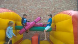 Dit springkasteel garandeert plezier voor iedereen.Klim op de buis en maak je klaar. Drie twee een start, wie slaat zijn vriendjes van de buis.Wint de jonge man tegen zijn Papa, of laat zus mama een kussentje kussen?Een zeer leuke attractie voor jong en minder jong,waar iedereen plezier aan zal beleven.(oppervlakte nodig 4X 4 m)Verhuur van deze attractie voor 1 dag kostprijs 80 euro excl. transportkosten (0.25 euro/ km) en 21 % btw Levering voor 10.00 uur en ophaling tussen 18.00 en 22.00 uurMail voor info Springkastelen Volgenda animatie Hoofdpagina Keuze paginaKussen gevecht